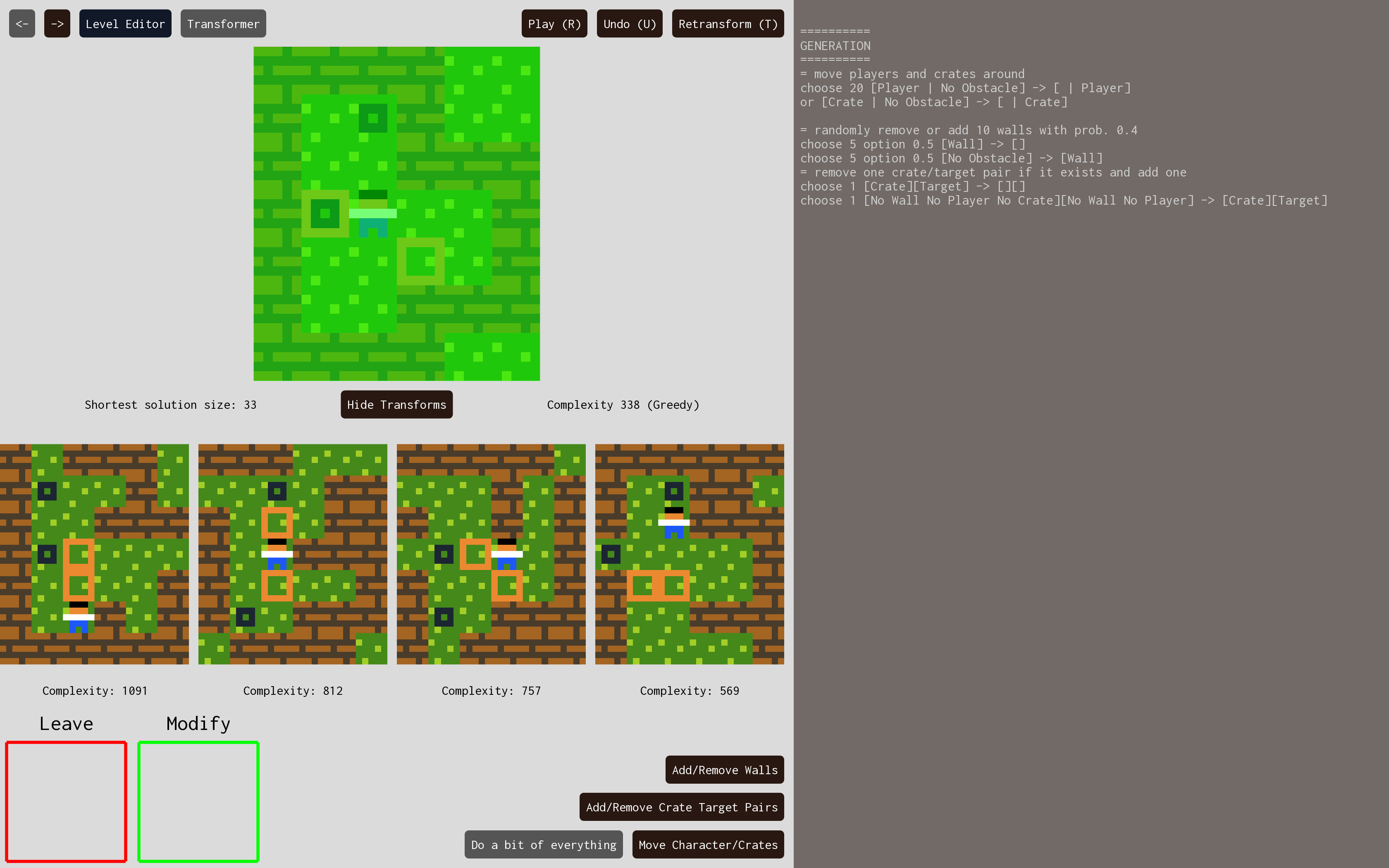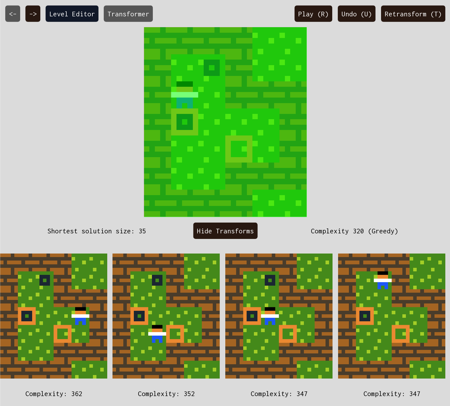 The transformer can be used to polish certain things at the end, like finding the most difficult starting position of the player in a Sokoban level. Also an often reoccurring problem is to know when to stop designing a level. The transformer can give you a level of confidence if it cannot find any simple transformations that would make the level significantly more interesting.