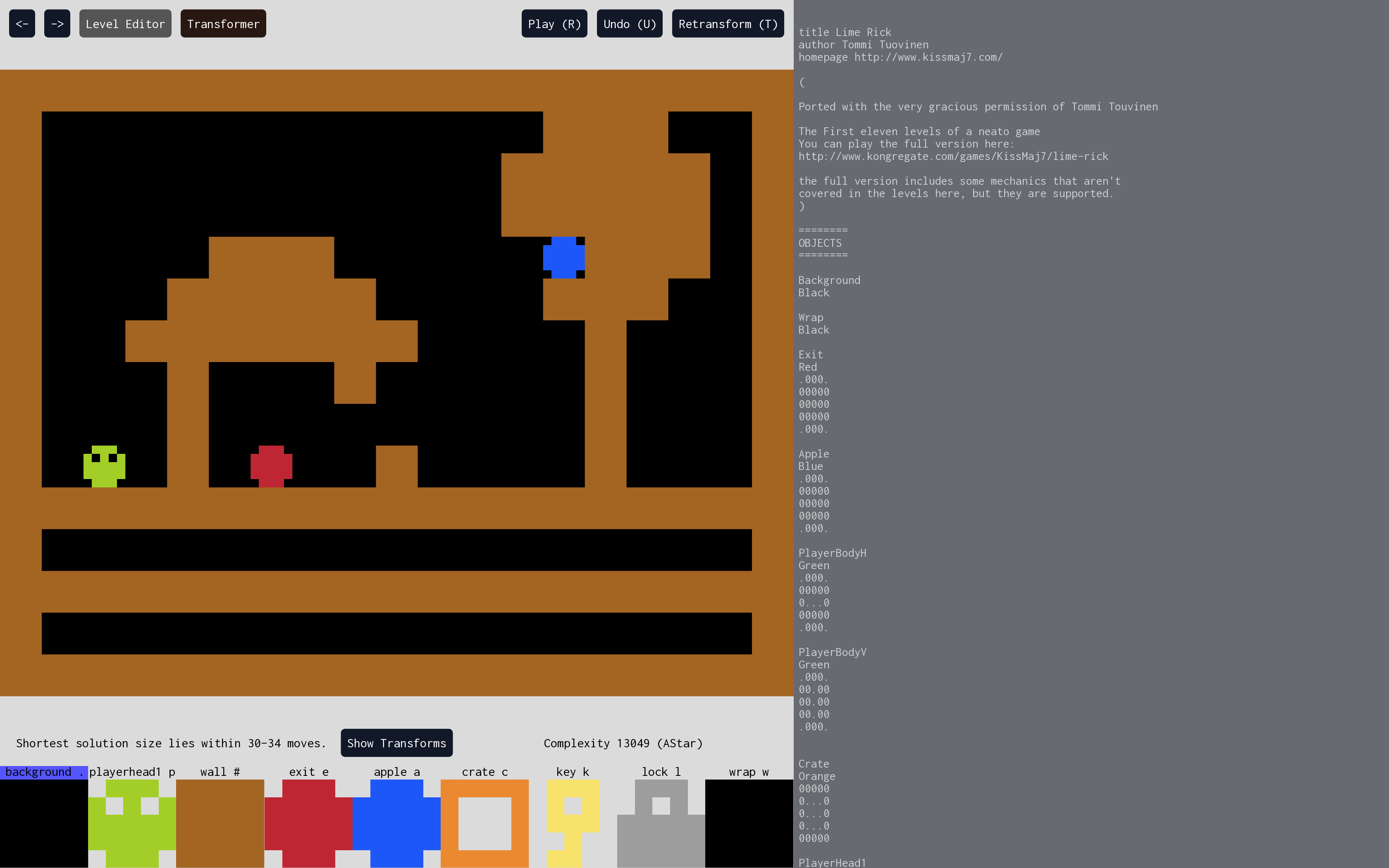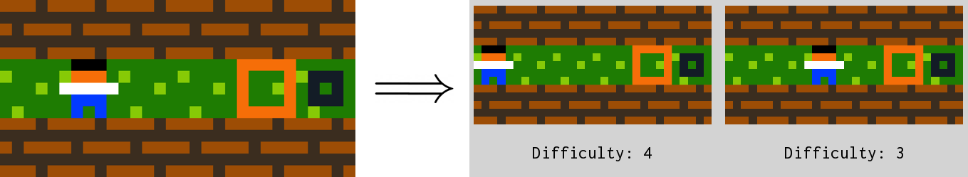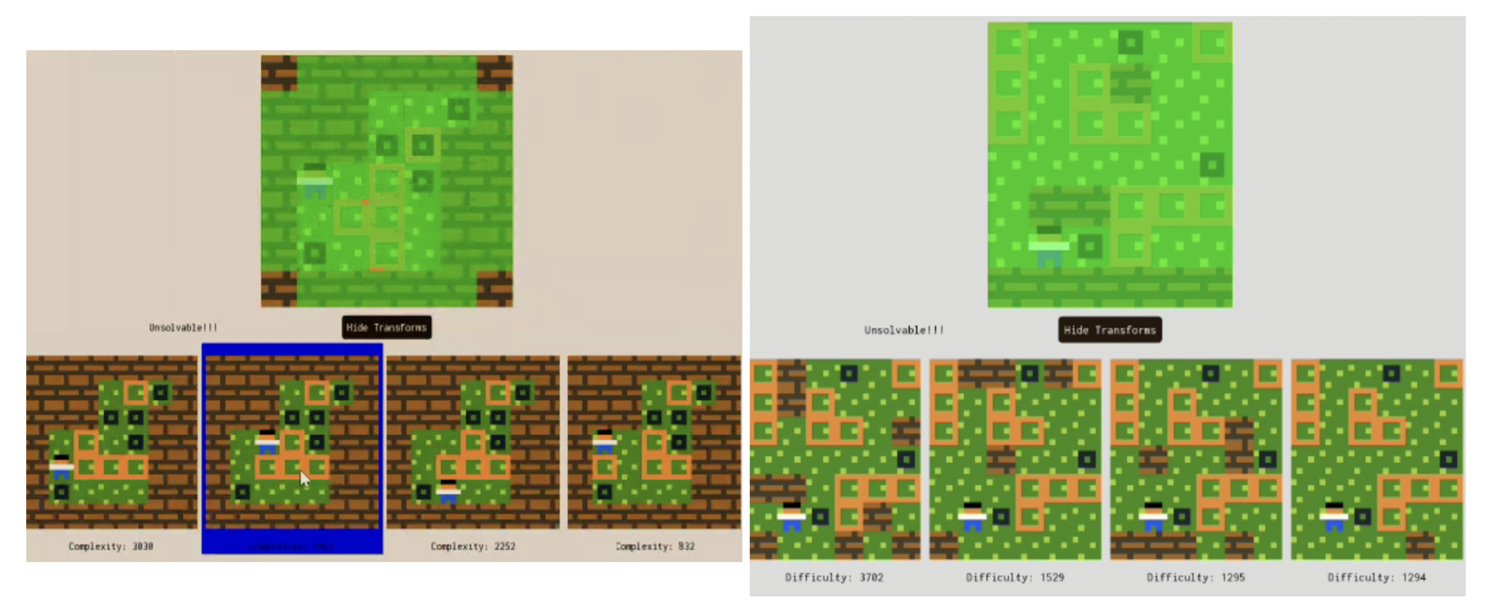 The final outcomes are then ranked according to their difficulty and presented to the designer. In this very simple example the level where the player is moved to the right is considered slightly more difficult than the level where the player is moved to the right. The difficulty metric is based on the number of states the fastest solver requires in order to find the solution and does not almost match human judgement. The transformer works best if the ratio of interesting levels is high in the search space and the levels need a moderately low number of steps to be solved. For more details on how the transformer works to get the most out of it read the paper. The following are example use cases of using a transformer for designing Sokoban puzzle games but the techniques apply to other puzzle games.